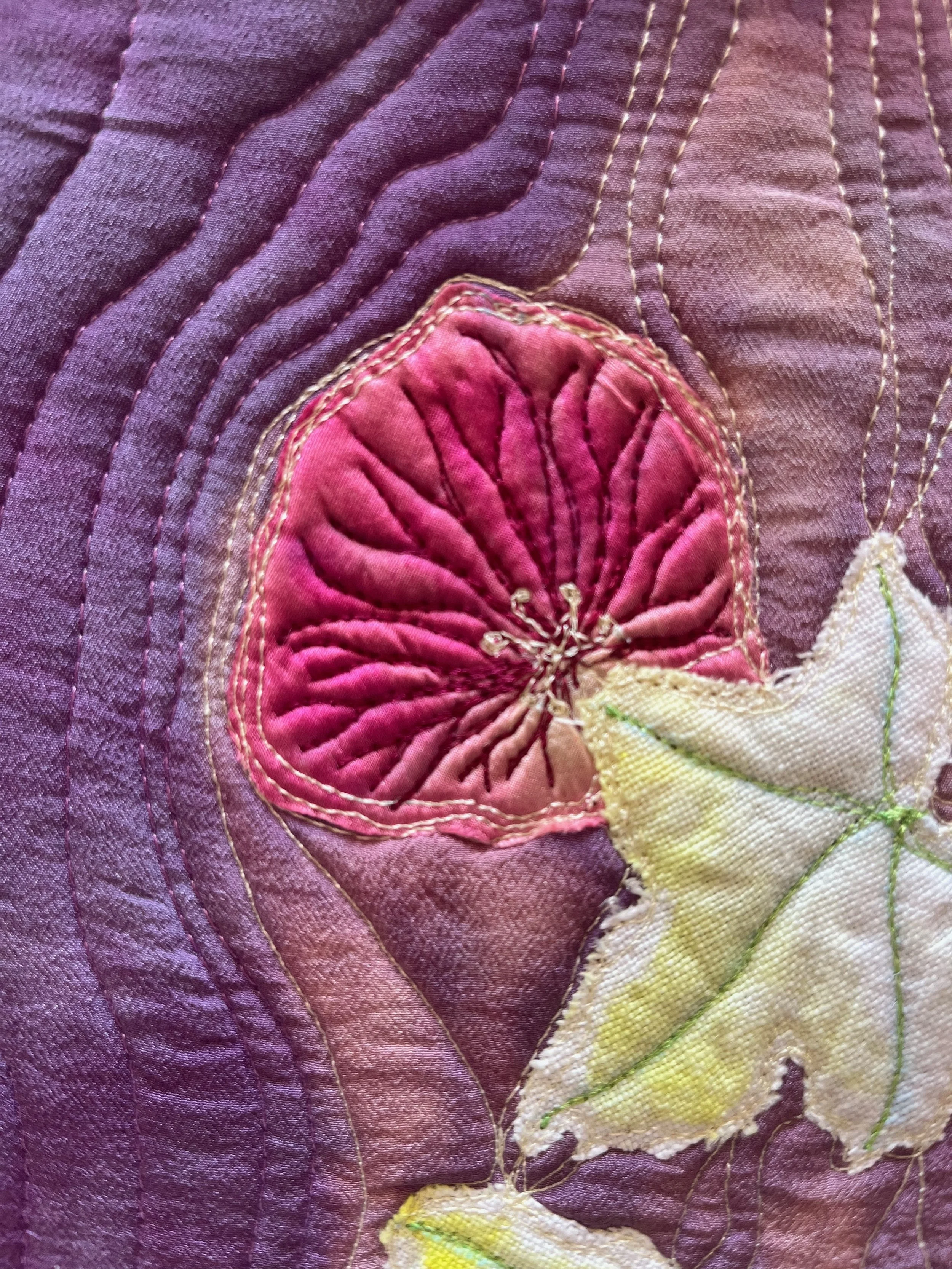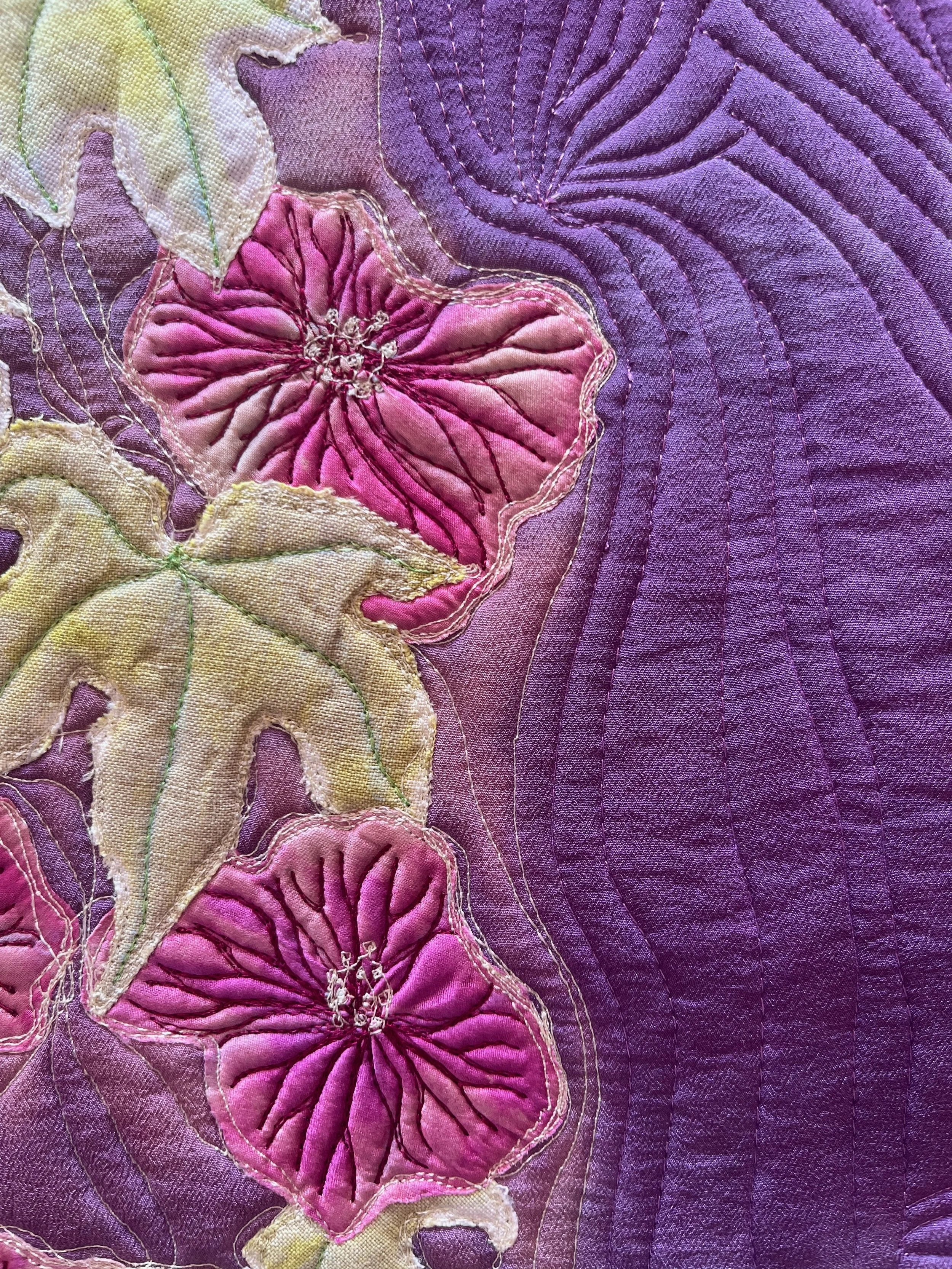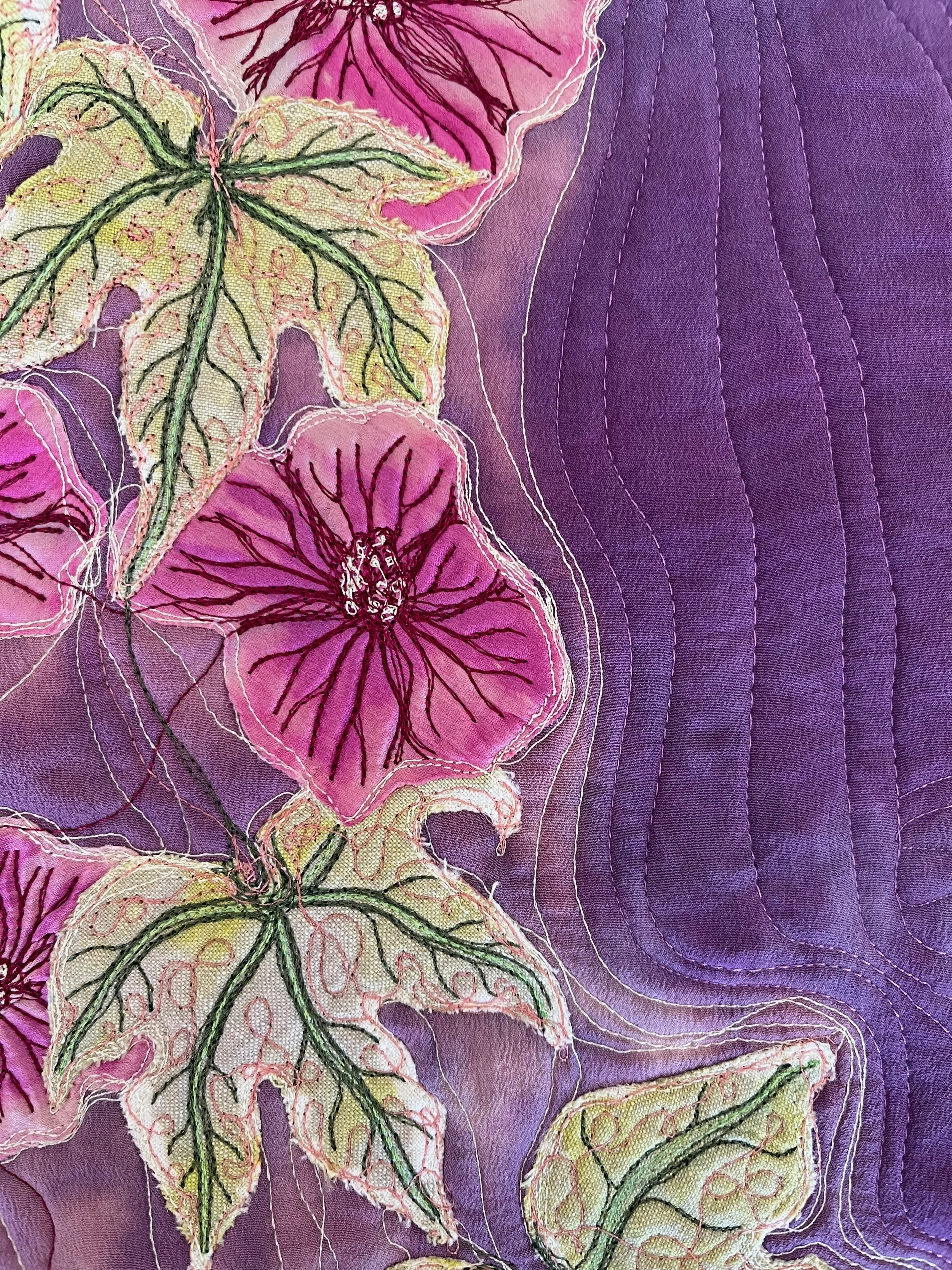 This piece is based on a photograph taken and given to me by a friend, Ann Bird. I dyed contrasting textures of silks for the flowers and background and linen for the leaves. I wanted to create a feeling of the flowers tumbling in a cascade of light so I added bleach to the background. When completed, I prefered the back of the piece and so it exists as a reversible artwork.