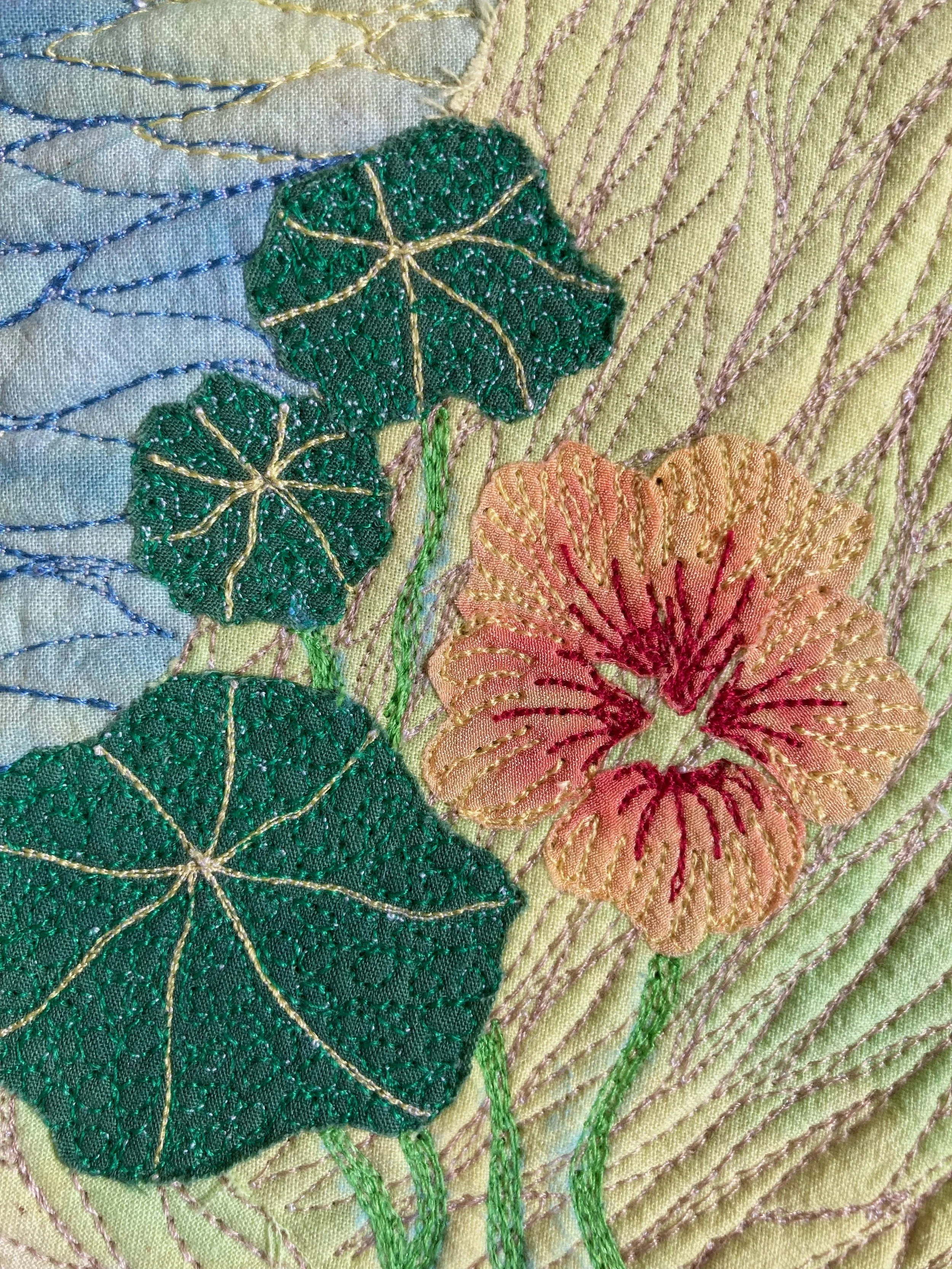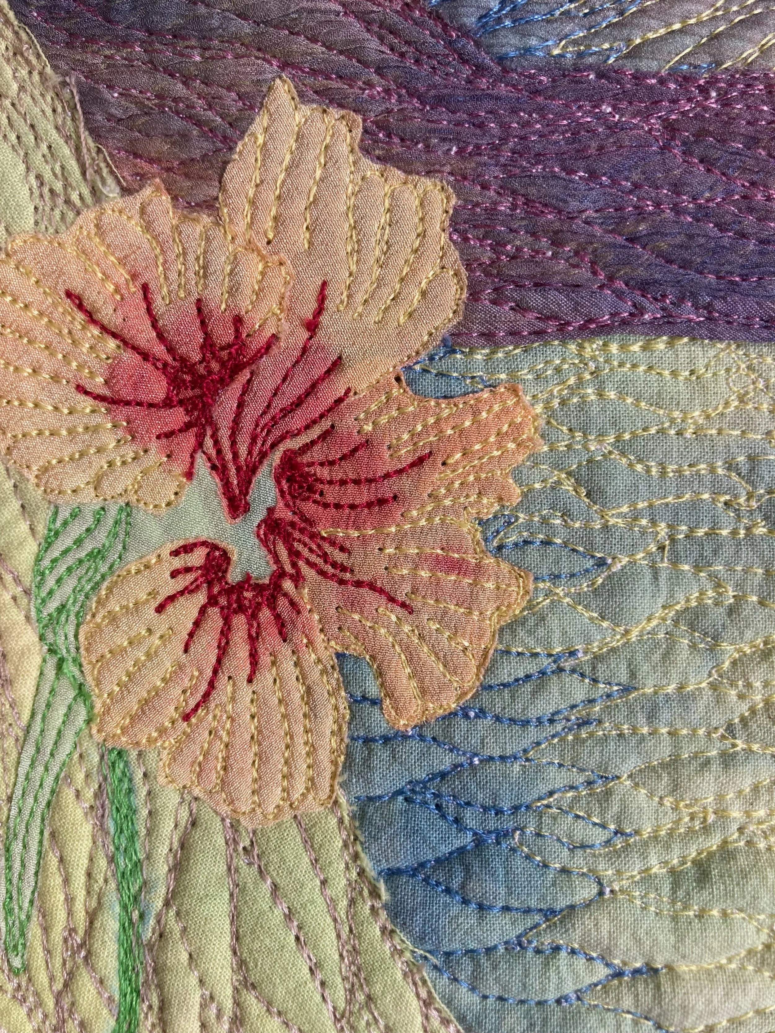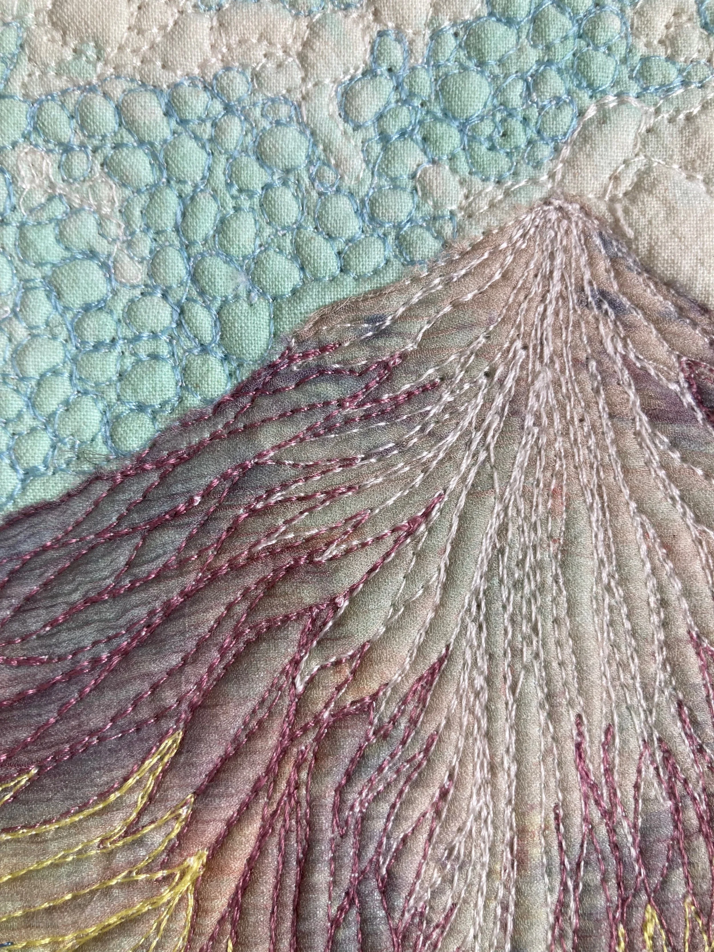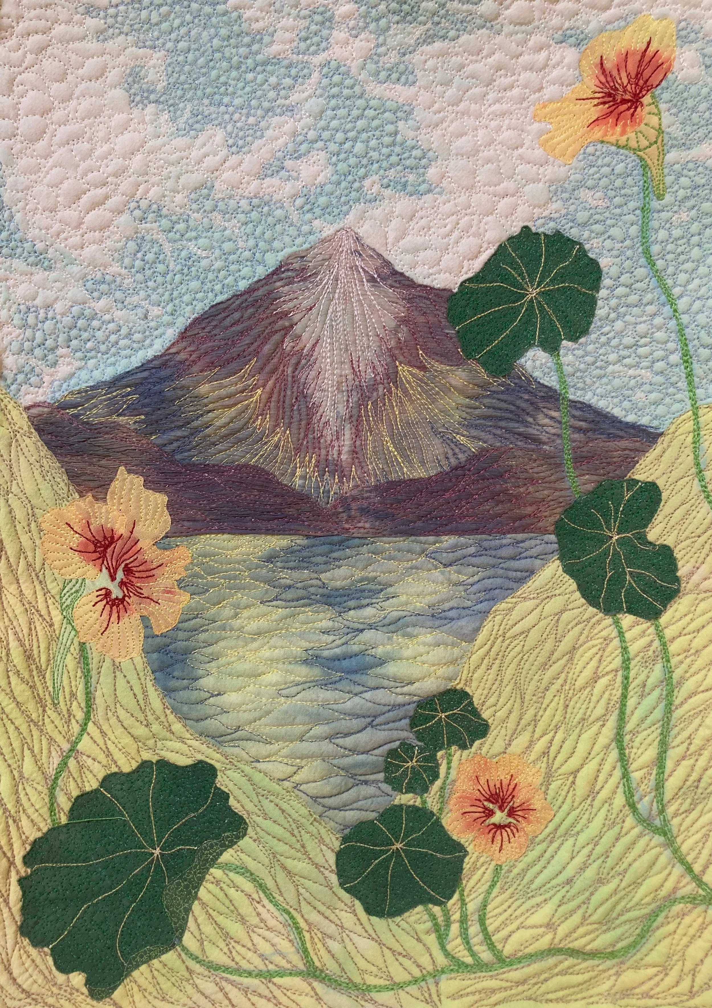 The mountain on Tenerife dominates the costal view from the north of Gran Canaria. The image alludes to its prominence in the landscape. It is made with hand dyed cotton and silk and embellished with free machine embroidery.