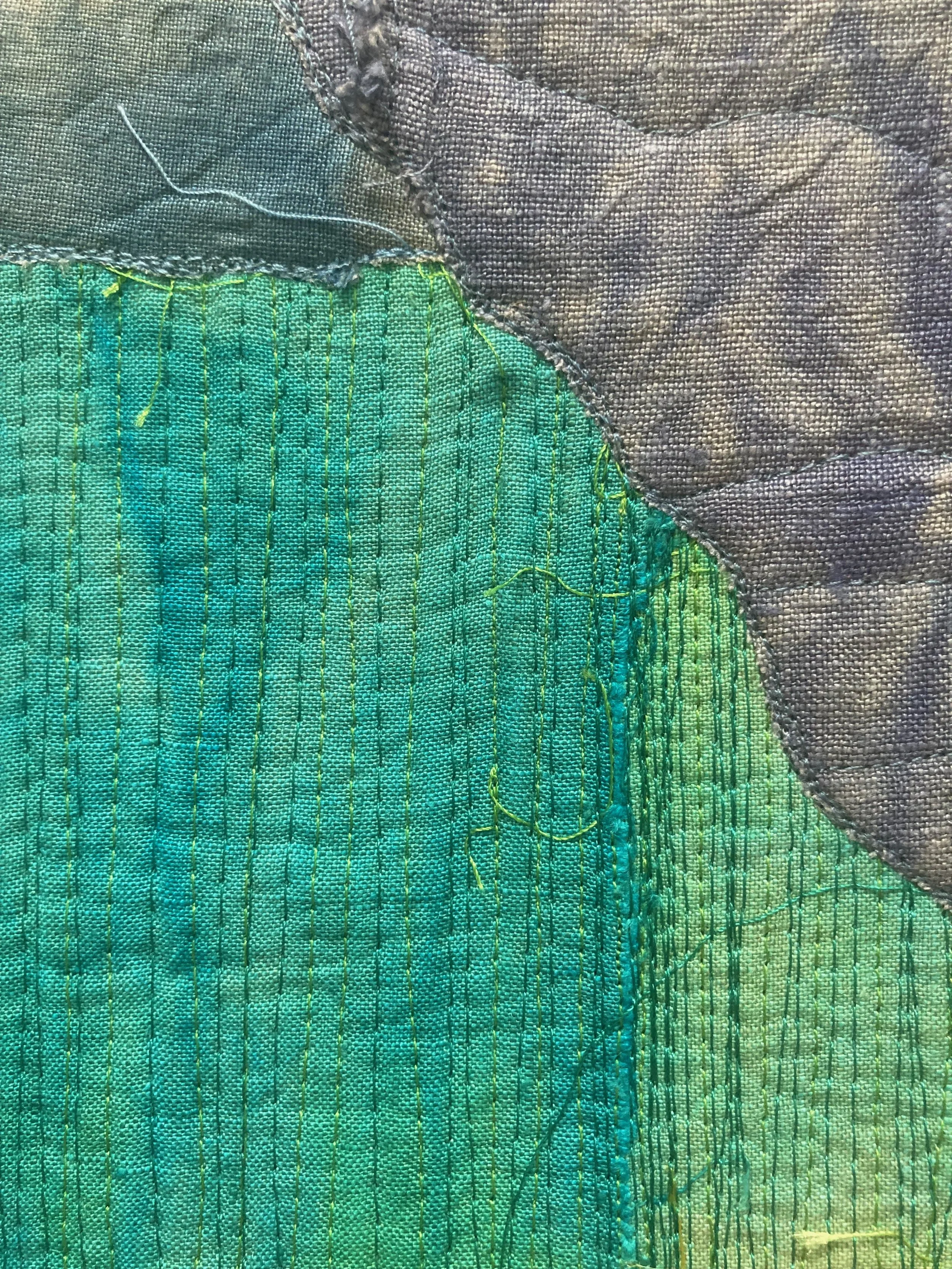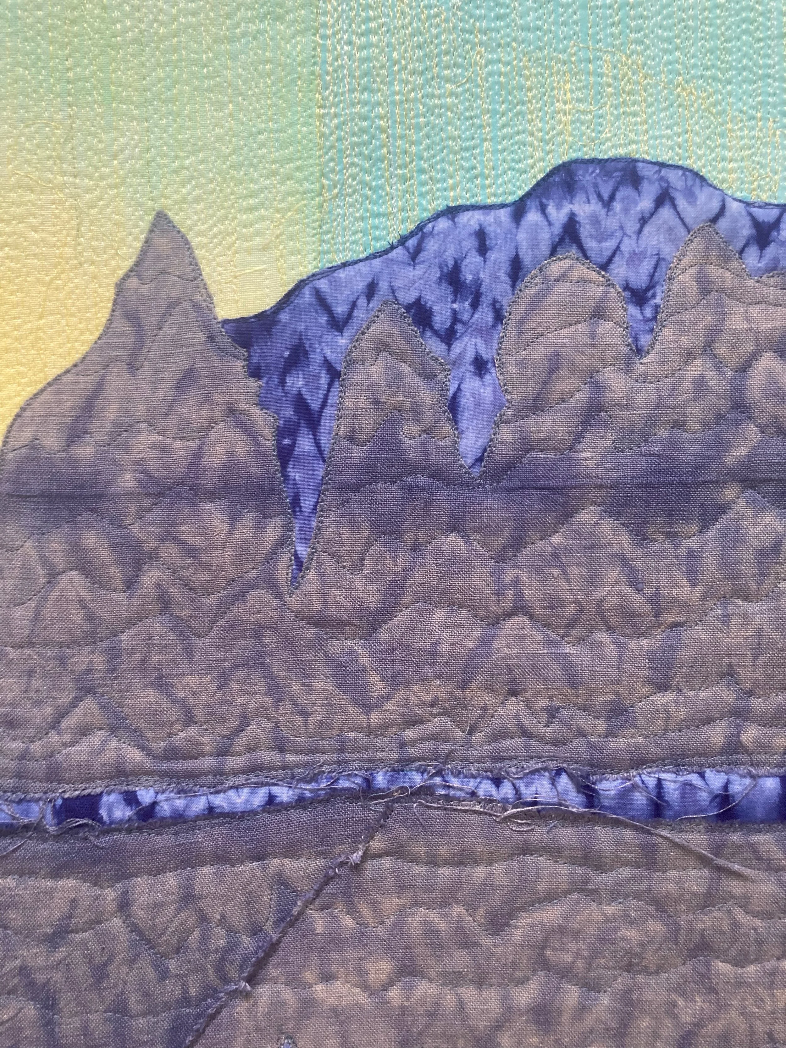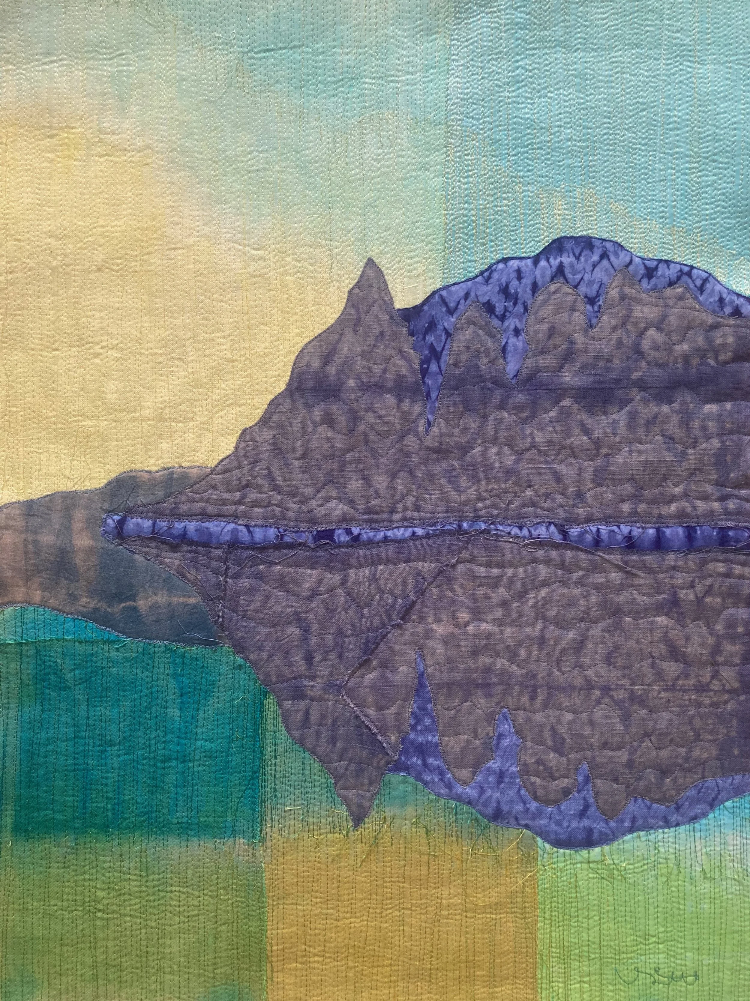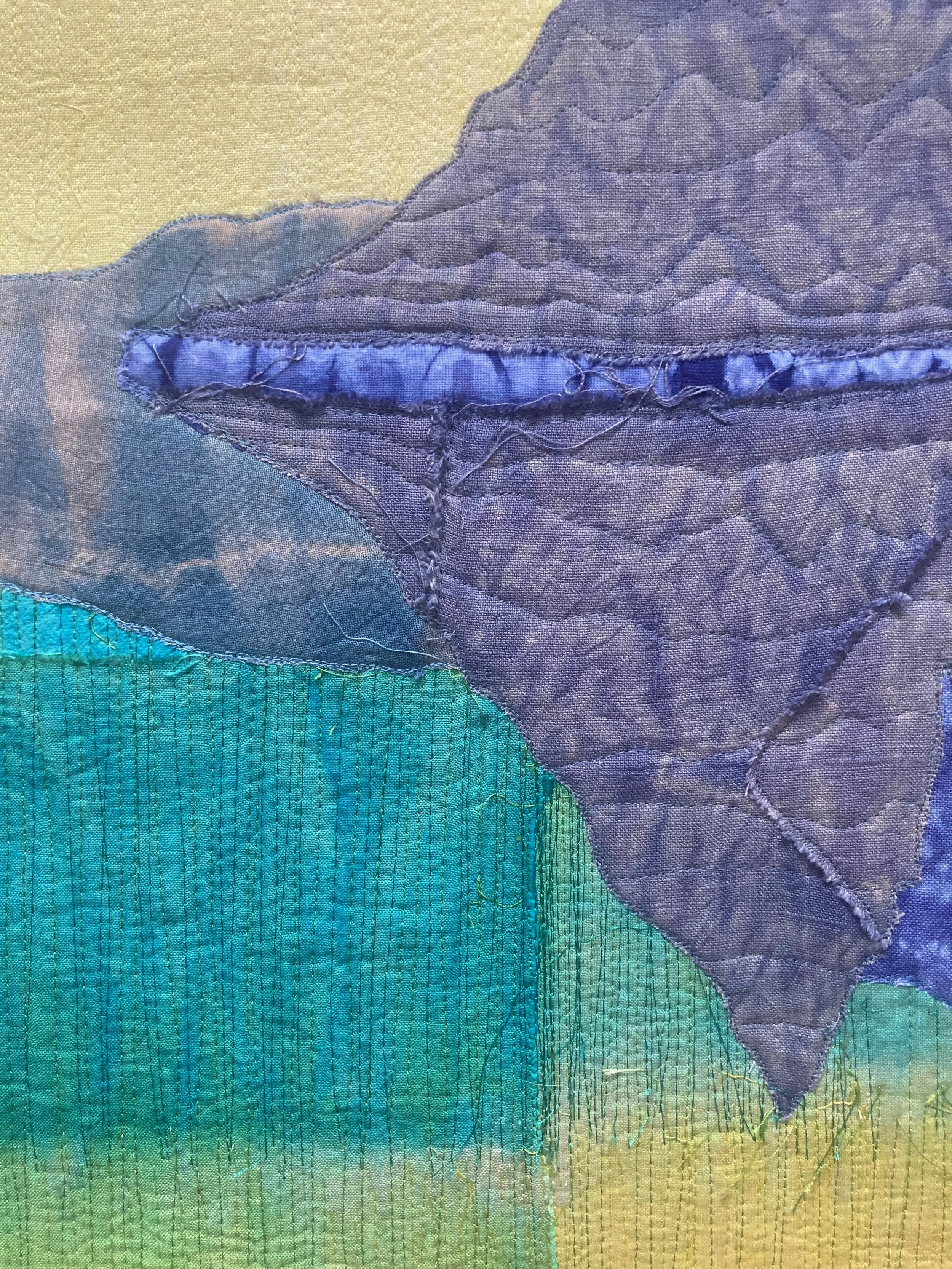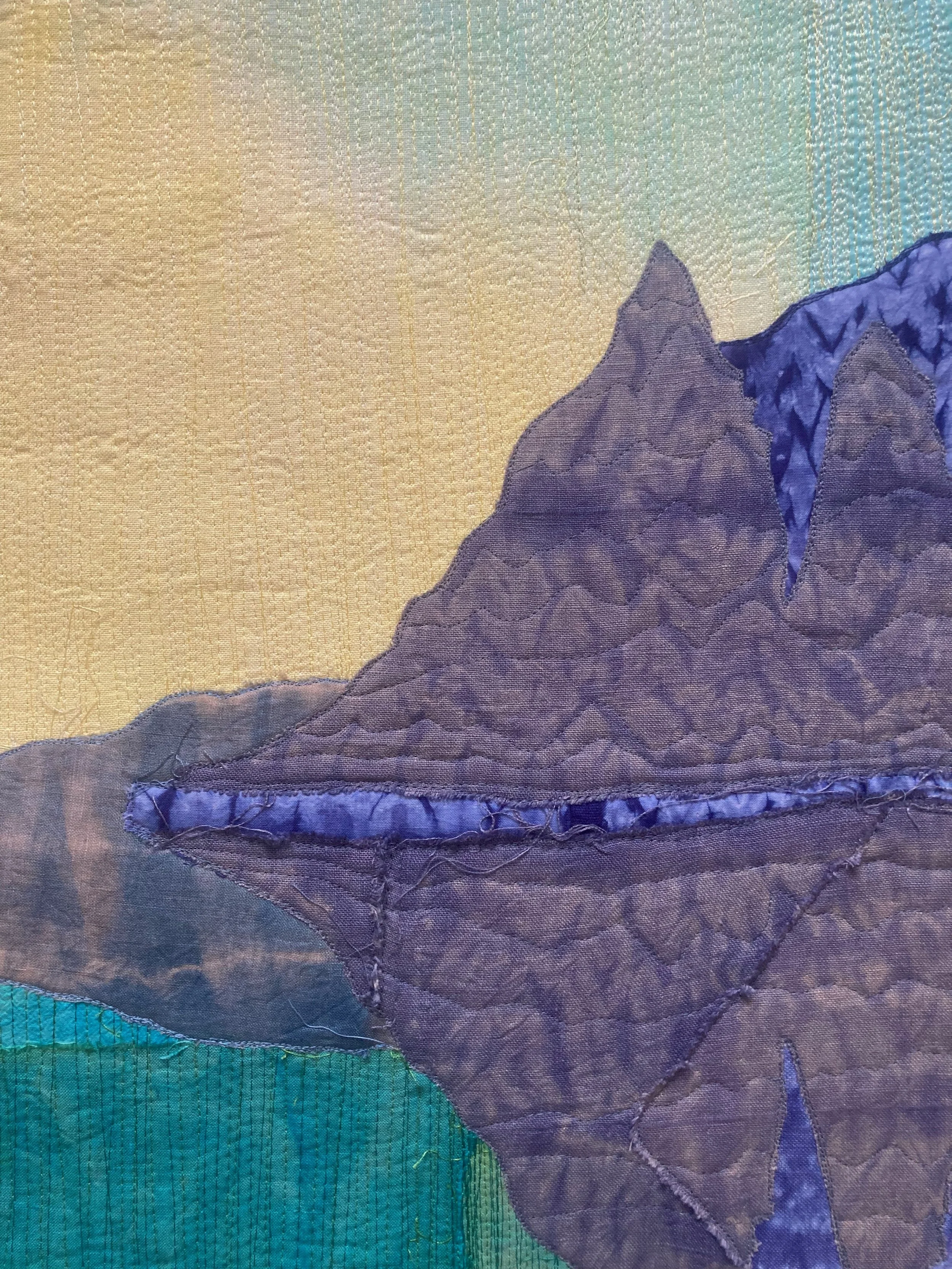 The quilt depicts a semi abstract image inspired by the screney of El Valle de Agaete. Hand dyed cotton, linen and silk create textures and add contrast to the work.